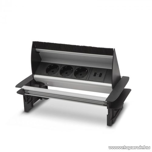 Süllyeszthető elosztó irodai és otthoni felhasználásra, fém házzal. Asztala, bútora legyen mindig elegáns és rendezett, mégis funkcionális. A beépített USB csatlakozónak köszönhetően könnyen töltheti mobil eszközeit. A rejtett elosztó kiváló megoldás lehet ha már például kész konyhával rendelkezik, de nincs elegendő konnektor a kívánt helyen. Ilyenkor falvésés és villamos hálózat bővítés nélkül, remek alternatíva lehet egy rejtett elosztó. Egy mozdulat és máris rendelkezésre áll 3 szabad konnektor. Ideális lehet olyan elektromos eszközökhöz, amit nem folyamatosan használunk, kenyérpirító, vízforraló... Ha használaton kívül vannak, az elosztó egy mozdulattal elrejthető, ezzel is megkönnyítve például a takarítást, valamint rendezett, letisztult külsőt ad a helységnek.