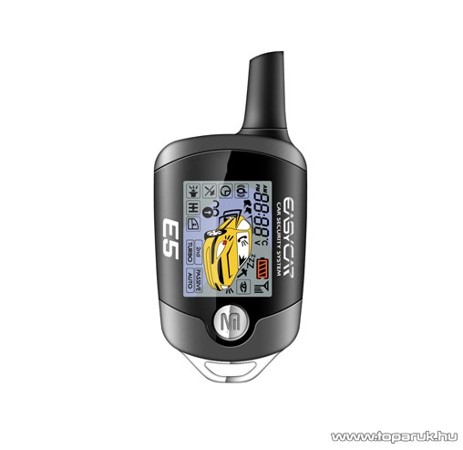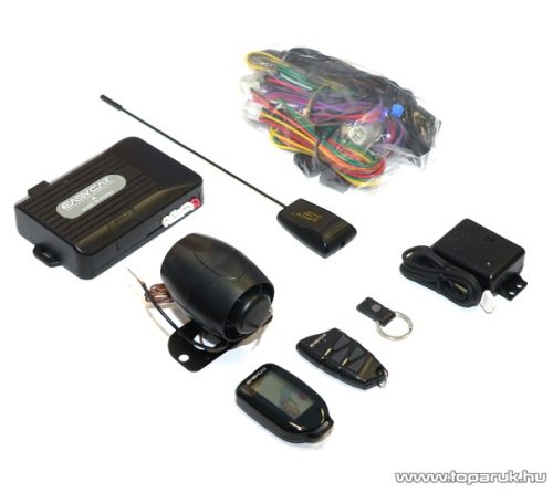 EASYCAR E5-A Autóriasztó, 1 db LCD + 1 db kiegészítő távirányító, bőrtok, sziréna, rezgésérzékelő funkcióval