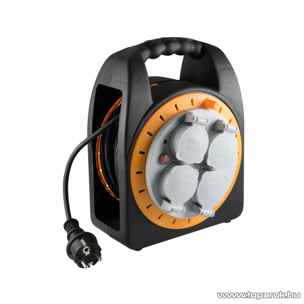 Kültérre csakis ezt válassza! A HJR 10-15 kábeldob masszív kialakítással rendelkező műanyag tartóval lett ellátva, amelyhez 15 méter hosszú H05RR-F 3G1,0 mm²-es, IP44 kültéri kivitelben készült kábel tartozik. A HJR 10-15 kábeldob négy db védőérintkezős aljzattal rendelkezik (mindegyike takarófedéllel védve), valamint visszaállító gombbal a kioldott hővédelem törléséhez. A termék teljesítménye: 2300 W – letekerve, 1000 W - feltekerve.