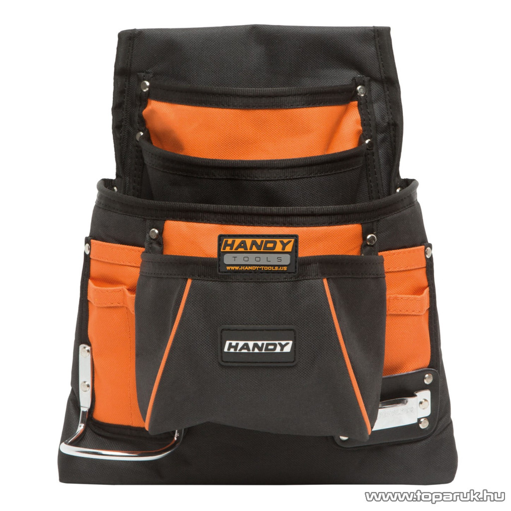 Különböző méretű zsebekkel rendelkező multifunkciós szerszámos övtáska, kalapácsakasztóval.