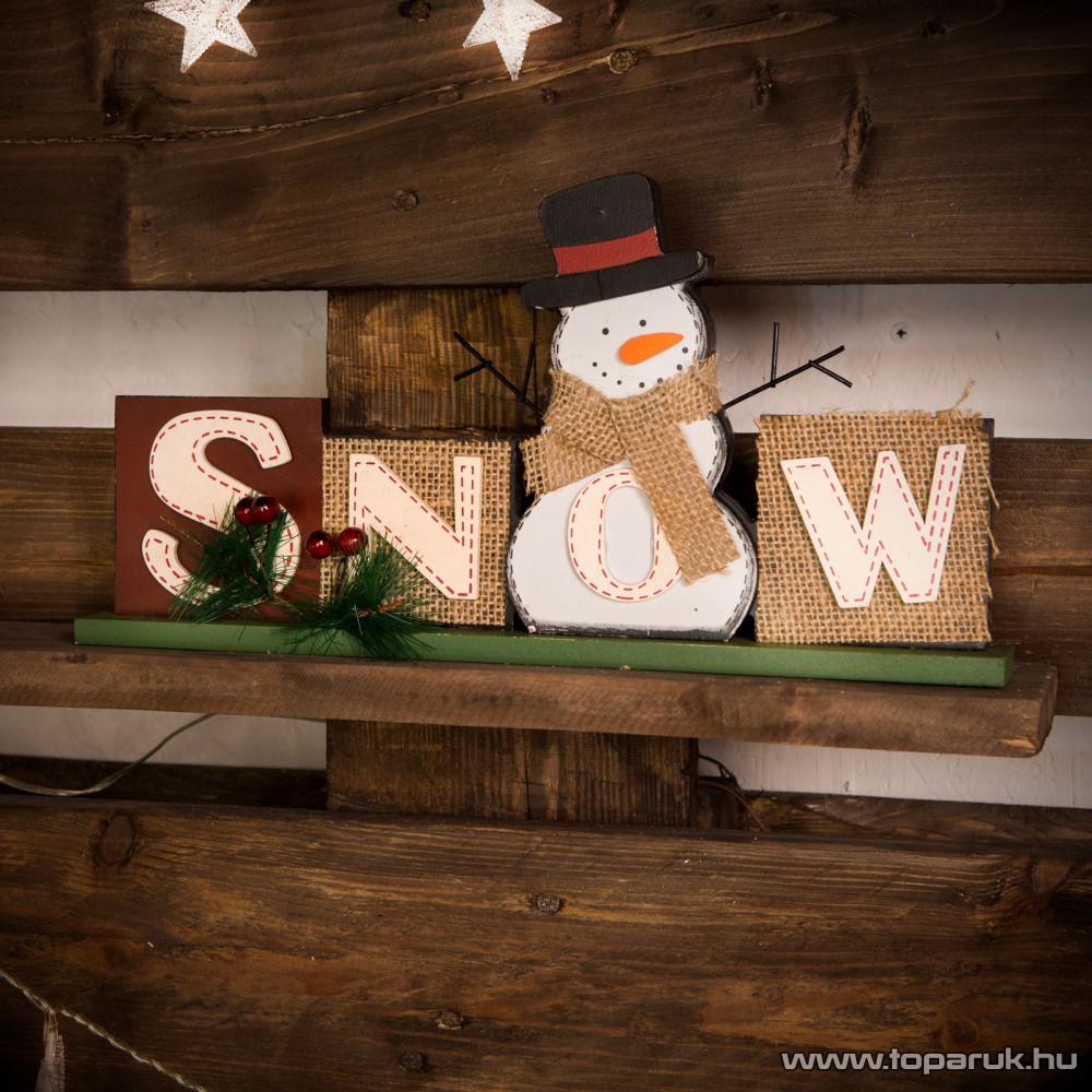 - Karácsonyi polcdísz "Snow" felirattal és hóember figurával.