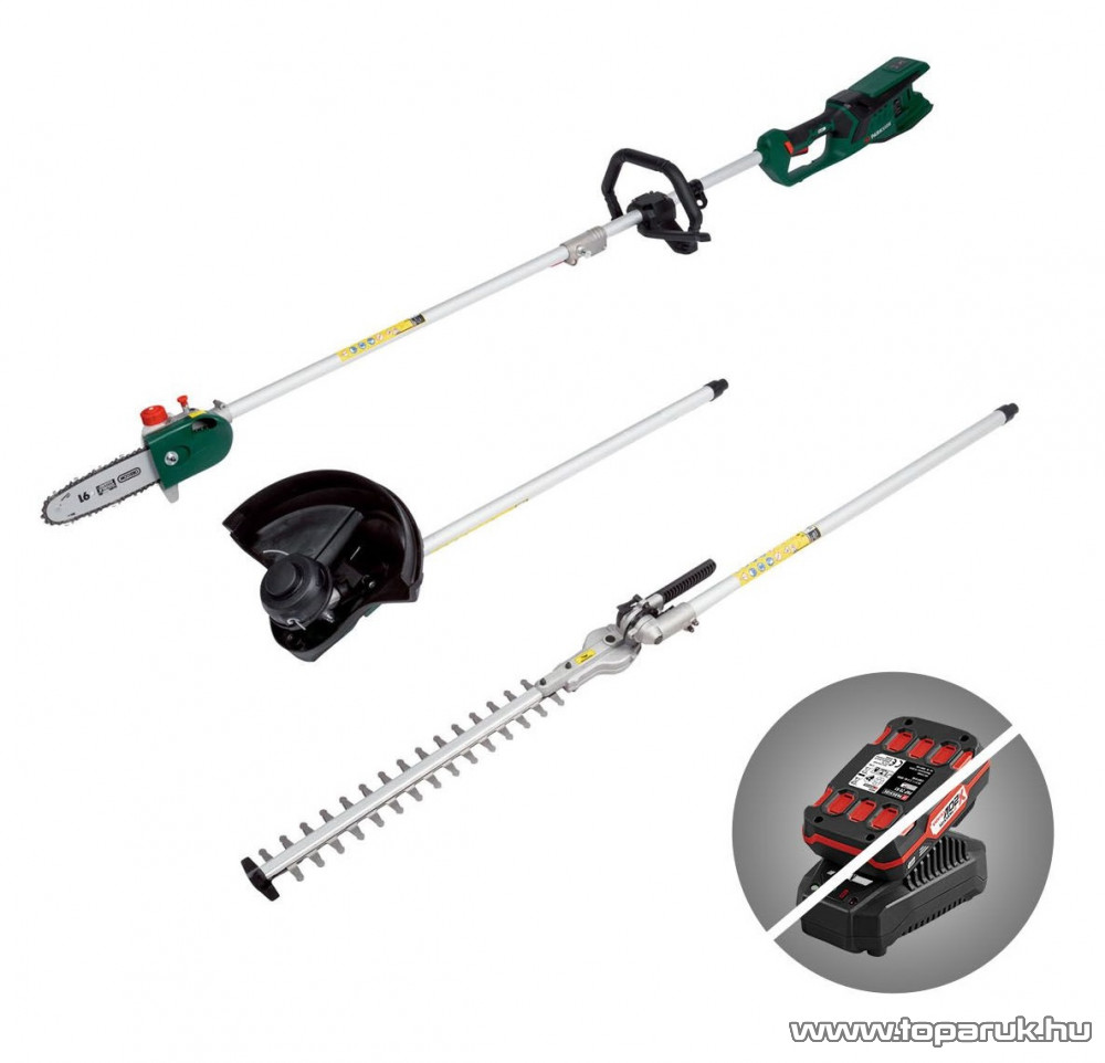 A készülék elektromos meghajtással rendelkezik. A készülék egy sövényvágó tartozékkal (biztonsági késrúddal), egy teleszkópos ágvágó tartozékkal (láncvezető lappal és fűrészlánccal) és egy trimmelő tartozékkal (damilorsóval vagy 3-ágú késsel) van felszerelve. A felhasználó védelme érdekében a készüléket csak lenyomott biztonsági kapcsolóval lehet működtetni. A kezelőelemek funkciója a melléklet használati leírásban található.