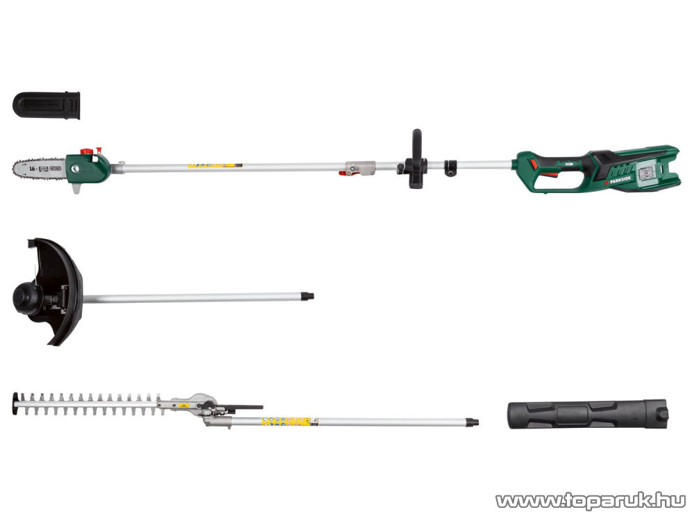 A készülék elektromos meghajtással rendelkezik. A készülék egy sövényvágó tartozékkal (biztonsági késrúddal), egy teleszkópos ágvágó tartozékkal (láncvezető lappal és fűrészlánccal) és egy trimmelő tartozékkal (damilorsóval vagy 3-ágú késsel) van felszerelve. A felhasználó védelme érdekében a készüléket csak lenyomott biztonsági kapcsolóval lehet működtetni. A kezelőelemek funkciója a melléklet használati leírásban található.