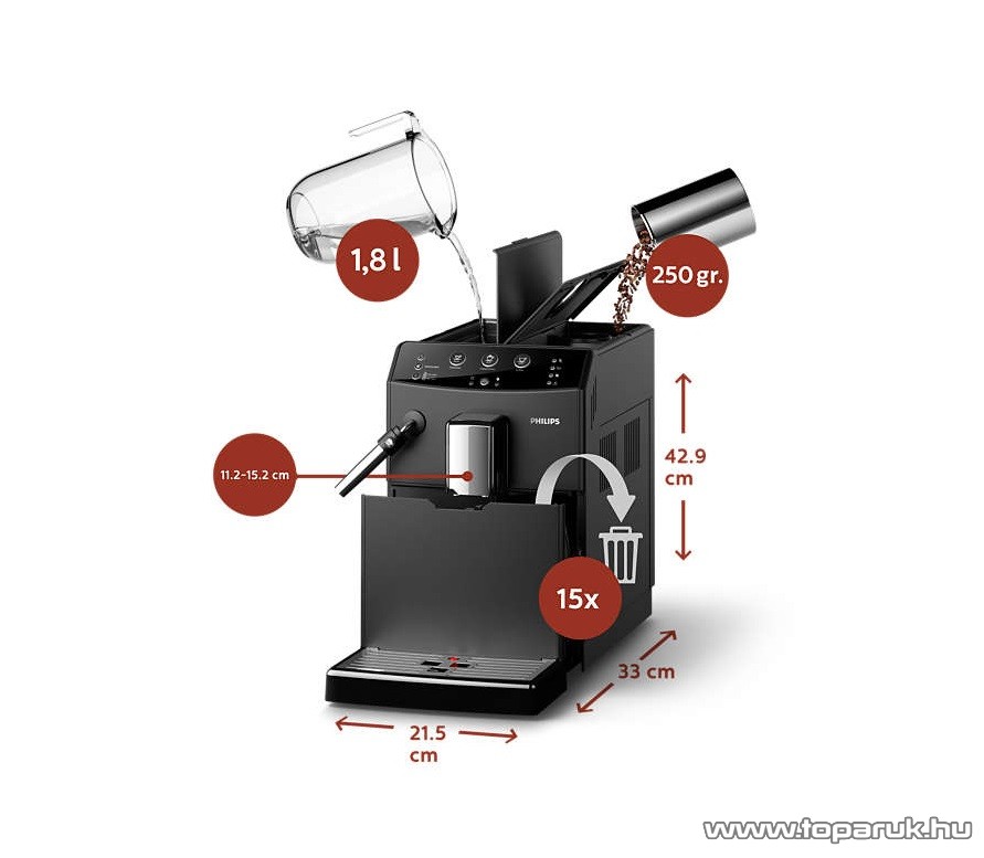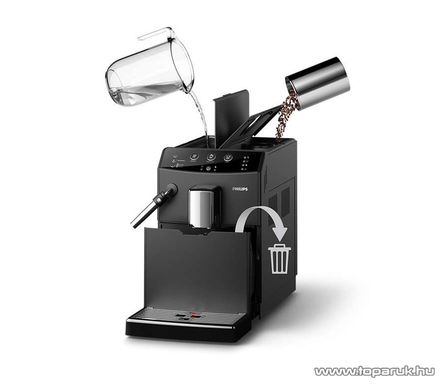 Élvezze a nagyobb helyet, valamint azt, hogy a nagy kapacitású, rendkívül praktikus kialakítású kávészem-, vízés hulladéktartályok sokkal tovább bírják a következő feltöltésig. Ez az intelligens, automata kávéfőző nagy kapacitású víztartályával, kávészemtartójával és hulladéktartályával maximális kényelmet és csúcsminőségű teljesítményt nyújt.