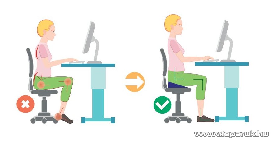 A párnát helyezze lehetőség szerint vízszintes ülőfelületre. A párna magasabb része a gerinc, az alacsonyabb fele a térd irányába esik. Talpai ülés közben stabilan támaszkodjanak a talajon. A párna puha huzata csökkenti a használat kezdeti szakaszában tapasztalható előre csúszó érzetet.