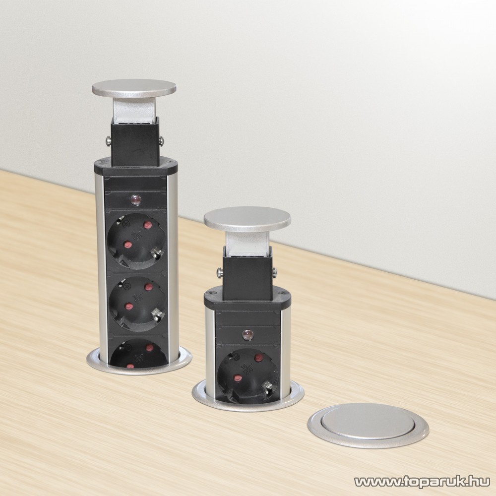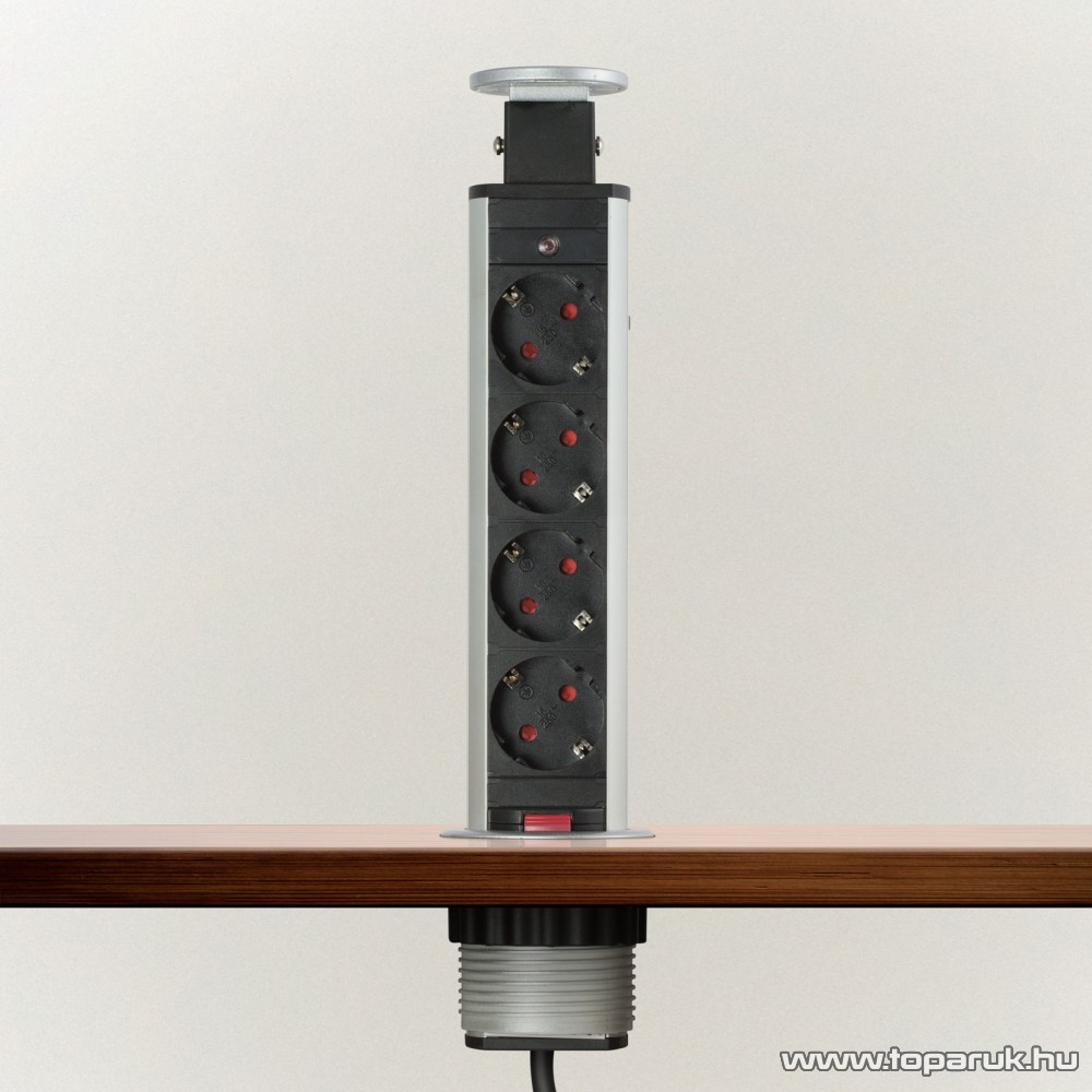 Süllyeszthető elosztó irodai és otthoni felhasználásra, fém házzal. Asztala, bútora legyen mindig elegáns és rendezett, mégis funkcionális. A rejtett elosztó kiváló megoldás lehet ha már például kész konyhával rendelkezik, de nincs elegendő konnektor a kívánt helyen. Ilyenkor falvésés és villamos hálózat bővítés nélkül, remek alternatíva lehet egy rejtett elosztó. Egy mozdulat és máris rendelkezésre áll 4 szabad konnektor. Ideális lehet olyan elektromos eszközökhöz, amit nem folyamatosan használunk, kenyérpirító, vízforraló... Ha használaton kívül vannak, a "töltőoszlop" egy mozdulattal elrejthető, ezzel is megkönnyítve például a takarítást, valamint rendezett, letisztult külsőt ad a helységnek.