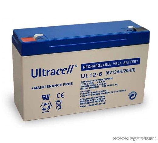 Ultracell 6V, 12Ah Zselés, ólom akkumulátor, gondozásmentes szünetmentes akku