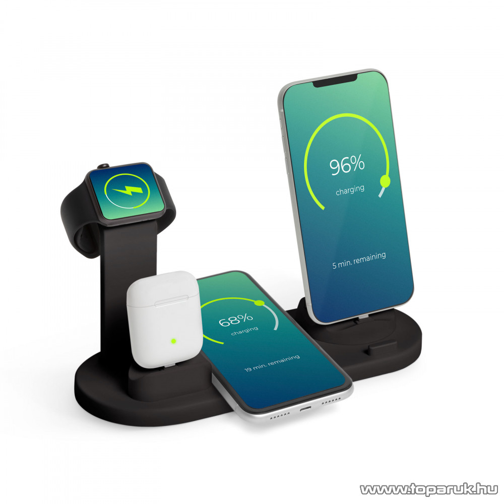 Multifunkciós töltőállomás, amely segítségével bármilyen ma használatos mobileszköz feltölthető! A készülék 6 db töltőcsatlakozóval rendelkezik, amelyek között megtalálható a vezeték nélküli töltés funkció is, így a család minden tagja megtalálja a számára szükséges töltési lehetőséget. A bal oldalon kialakított lightning csatlakozó lehetővé teszi AirPods fülhallgatók töltését, a vezetéknélküli töltő segítségével feltölthetjük mobiltelefonunkat (ha gyárilag rendelkezik ilyen funkcióval), de a töltőállomásba könnyen integrálható Apple Watch töltőmodul is, így minden eszközünk egy helyen tölthető, akár egyidőben is. A töltőállomás kellemes tapintású műanyagból készült, a fekete design jól mutat bármely helyiségben.
